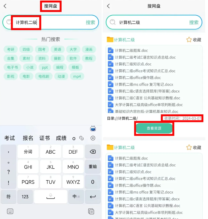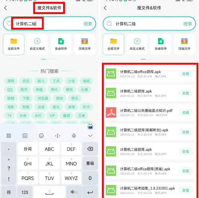 2、比如打开搜文件/软件,输入关键词后即可搜到对应的资源,顶部还可以限制资源类型,比如安卓软件、压缩文件、文档资料等等。