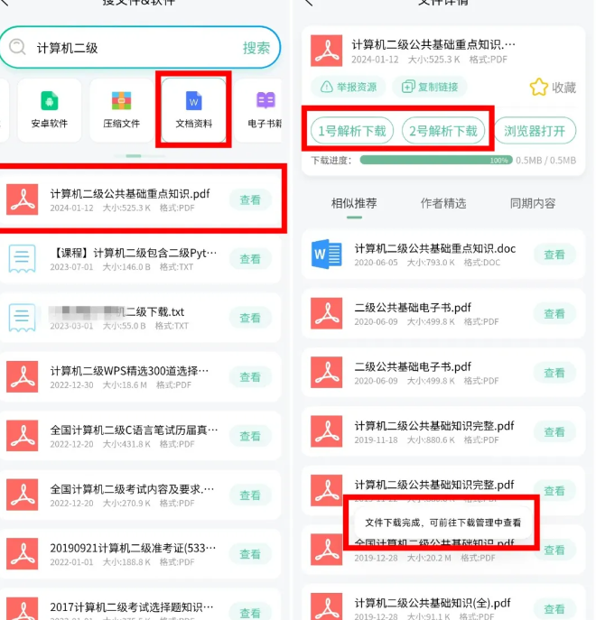 3、我们这里限制成文档资料,然后选中,点击下载,即可保存到本地。
