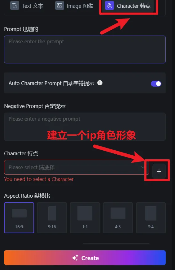 点击创建视频,选择角色(我使用了中文同步翻译),然后点击下面的加号,首先创建一个IP图像角色。