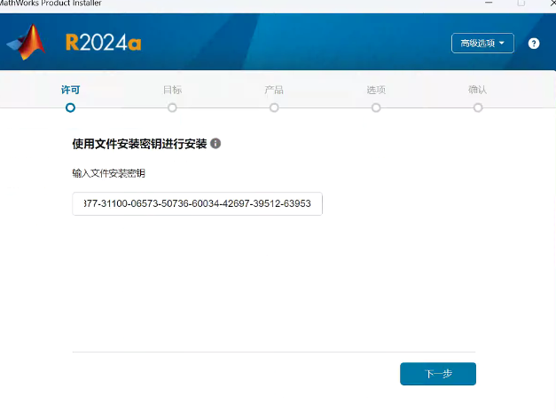 6.输入安装密钥【21471-07182-41807-00726-32378-34241-61866-60308-44209-03650-51035-48216-24734-36781-57695-35731-64525-44540-57877-31100-06573-50736-60034-42697-39512-63953】(建议复制输入),点击【下一步】。