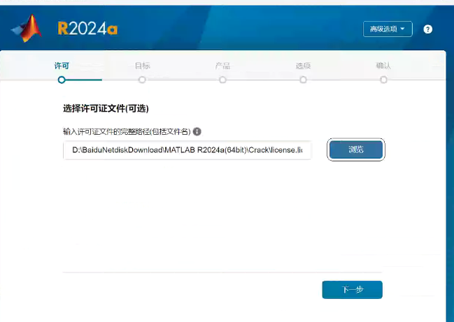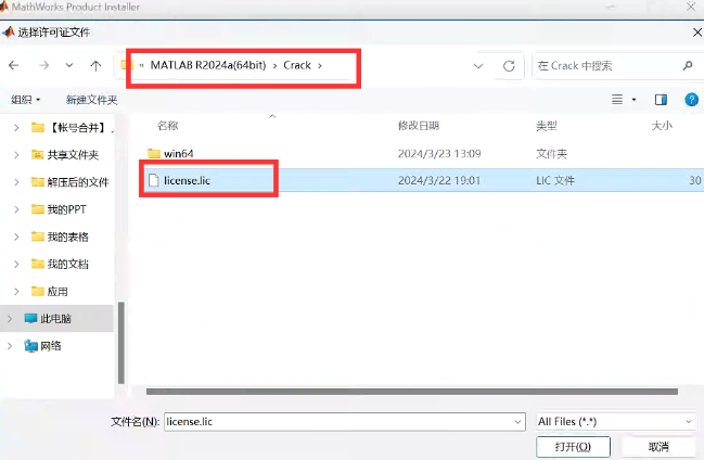 8.选择解压后的【MATLAB R2024a(64bit)】文件夹中【Crack】文件夹下的【licese.lic】,点击【打开】。
