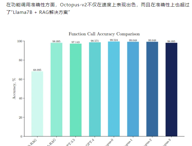 在功能调用准确性上提高了31%。它在基准数据集上的功能调用准确性与GPT-4和RAG + GPT-3.5相当,得分在98%到100%之间。