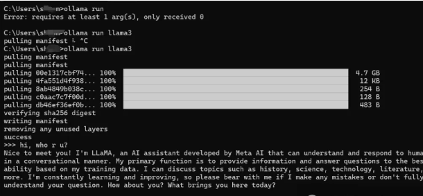 界面显示如下,程序会把权重文件下载下来,默认下载的是llama3:8b。