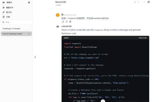 这里我采用了开源项目 open-webui,网址:https://github.com/open-webui/open-webui 。该项目的ui和chatgpt非常类似,截图如下: