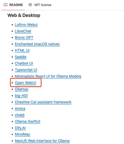 完成docker下载后,我们去ollama的github中选一个开源的webUI项目,我这里以Open WebUI为例