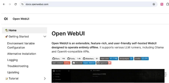 点击Open WebUI链接,进入它的说明网站,获取用docker下载该项目的命令