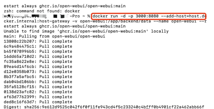 打开电脑的命令行终端,将这段代码复制并运行,能看到docker开始下载webUI项目了
