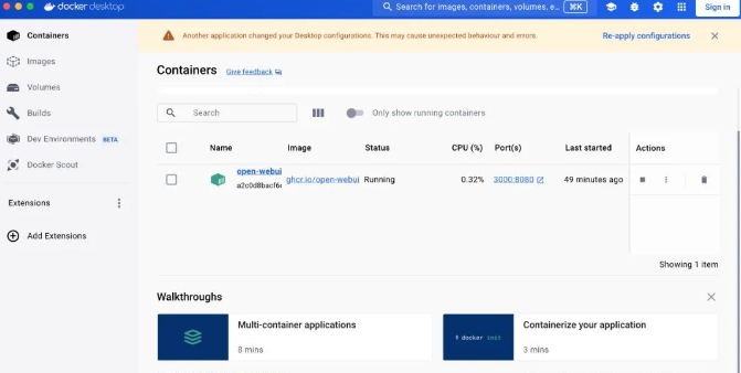 下载好后,打开docker客户端,能看到Open WebUI项目,点击Port下的端口号