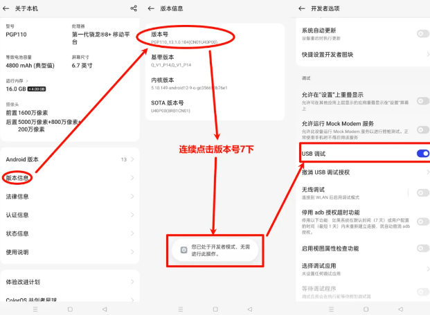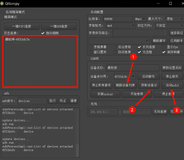 点击刷新设备会看到有设备号更新出来-点击获取设备IP-点击启动adbd