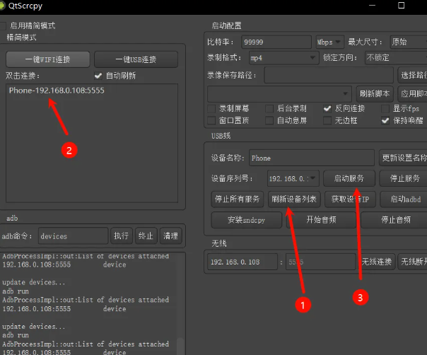 无线连接-再次点击刷新设备,发现多出了一个 IP 地址开头的设备,选择这个设备-启动服务。