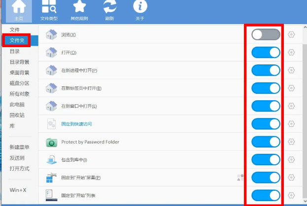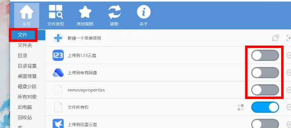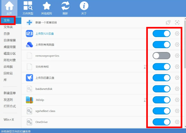 2、 打开后,可以看到软件功能布局非常明确,左侧可以选择操作对象,比如文件,右侧可以对选择文件时的右键功能进行开关。比如很多人的右键可能有上传到XX网盘,但基本用不上,可以直接关闭。