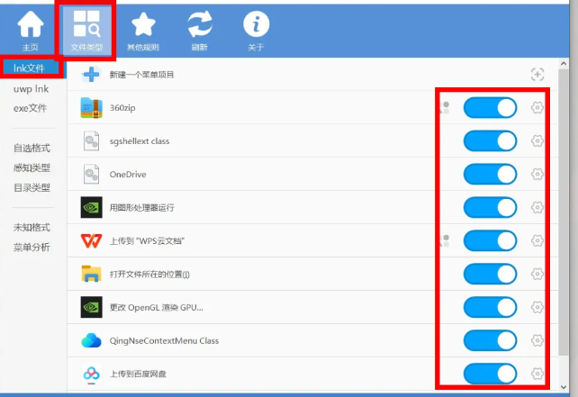 4、 在上方还可以针对文件类型进行右键管理,如lnk,可以打开或关闭上传到XX网盘,用图形处理器处理等。