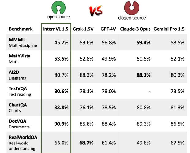 高性能:在多个基准测试中,InternVL-Chat-V1.5 接近 GPT-4V 和 Gemini Pro 的性能。