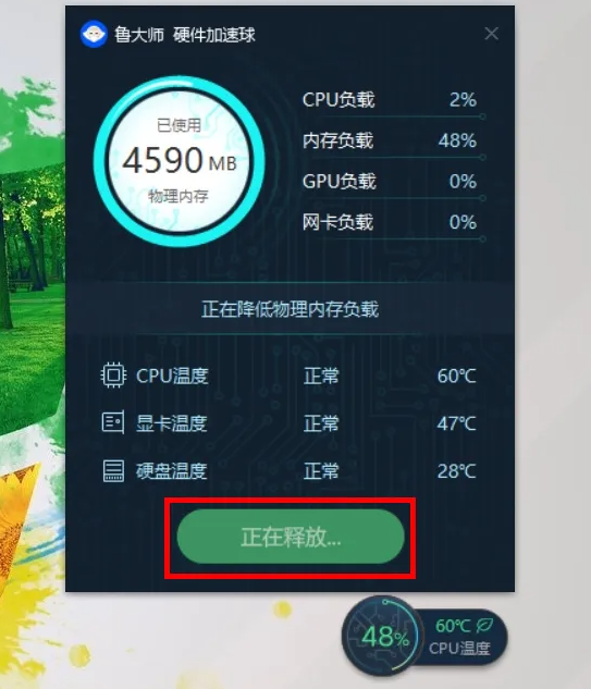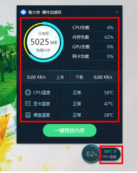 3、单击加速球,可以显示CPU负载、内存负载、GPU负载、CPU温度、显卡温度和硬盘温度等信息。