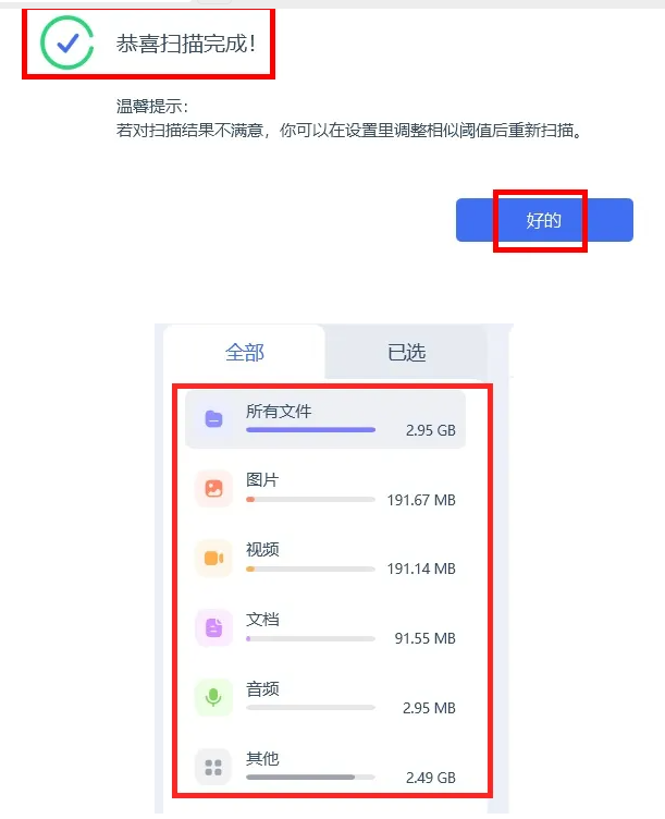 4、扫描完成后,可以看到重复的所有文件,以及图片、视频、音频、文档等分类查看。