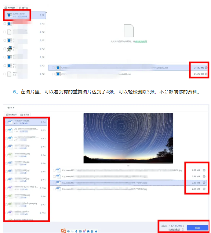 在该删的文件中,其中有不少事重复文件,他们也会占据很大的磁盘空间。