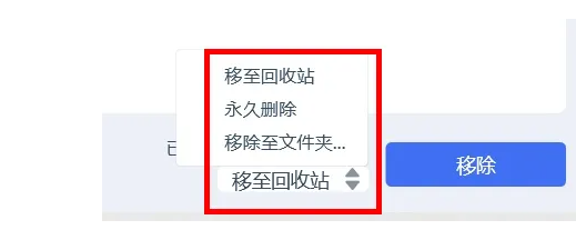 8、右下角可以选择移除的效果,有移至回收站、永久删除等选项。