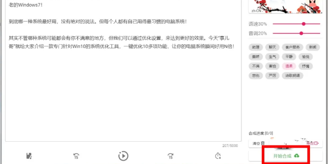 7、一切设置完毕后,点击底部的“开始合成”,几秒钟后就可以合成语音了。软件处理速度很快。