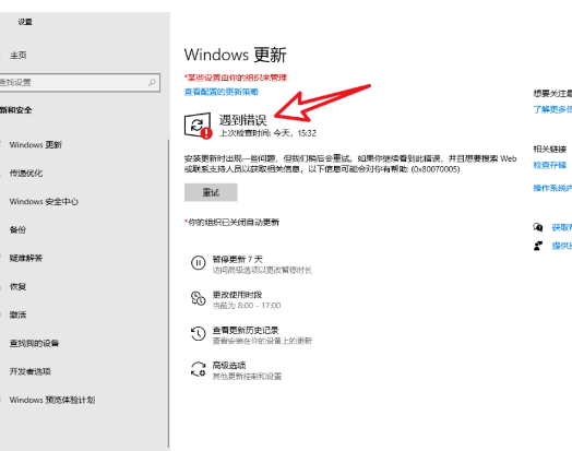 如果此时,你禁用了更新而禁用了更新以后,在Windows更新里点更新后,会提示“遇到错误”,系统无法更新。
