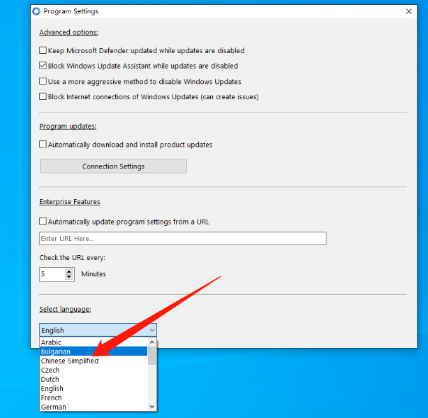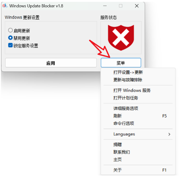 这是一款专为禁用Windows系统更新而生的工具,安装后即可使用。由于软件来自国外,默认语言依旧为英文,需要手动设置为中文。软件支持从Windows7到Windows11的所有版本的Windows系统。
