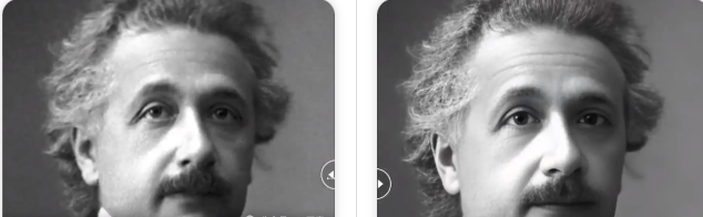 还有这张爱因斯坦修复的照片就更厉害了 不仅眼神更加锐利 头发、眉毛等细节都被完美修复出来了